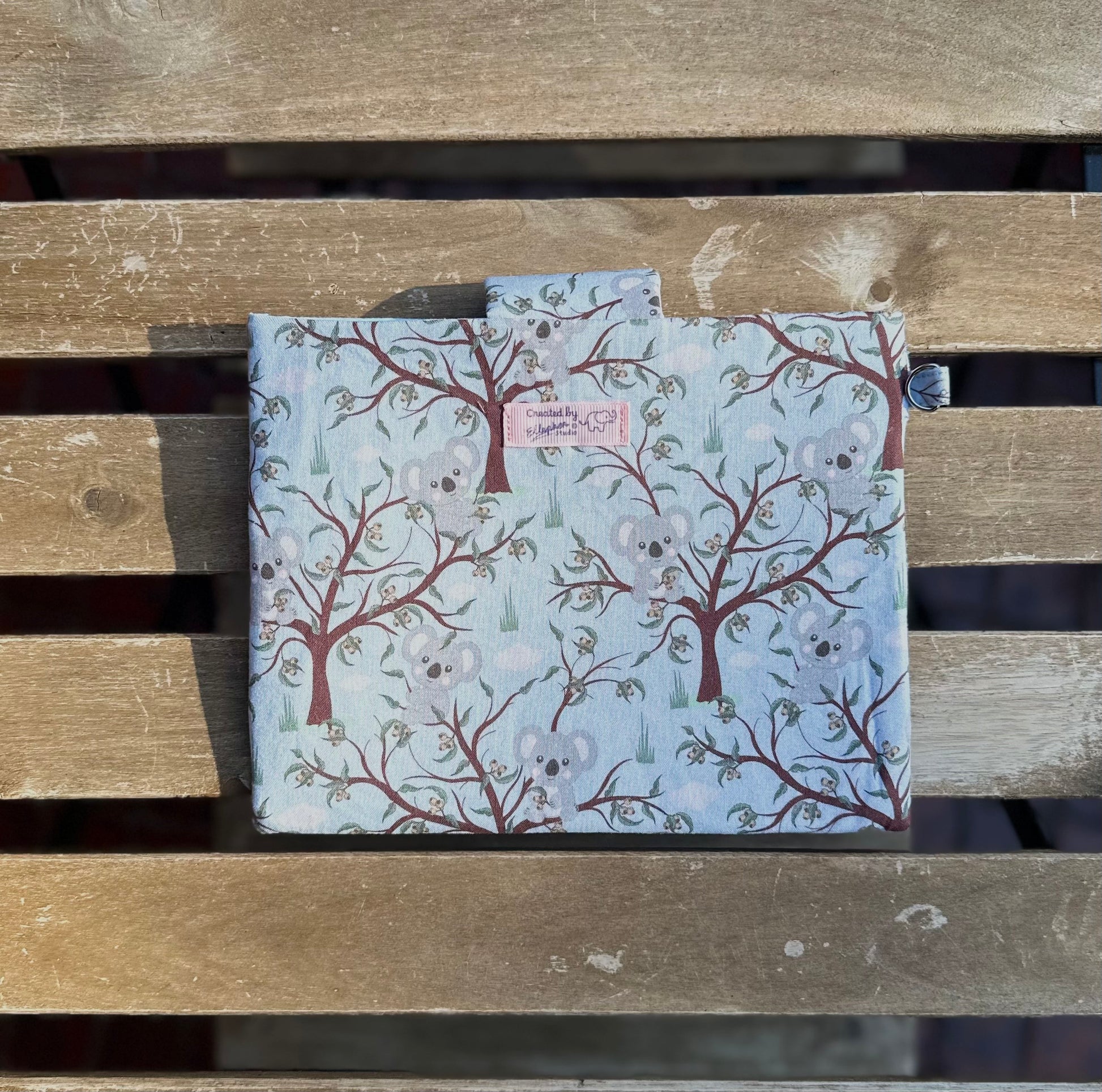 Created with 100% cotton fabric and fleece. Suitable for small to medium size books or tablets. Snap button closure. Size = 23.5 cm x 18.5 cm.